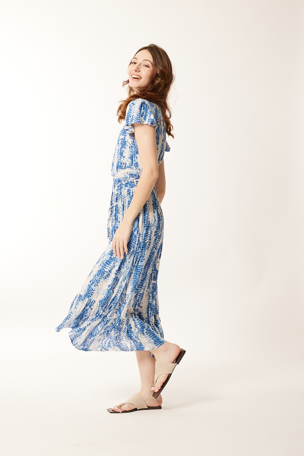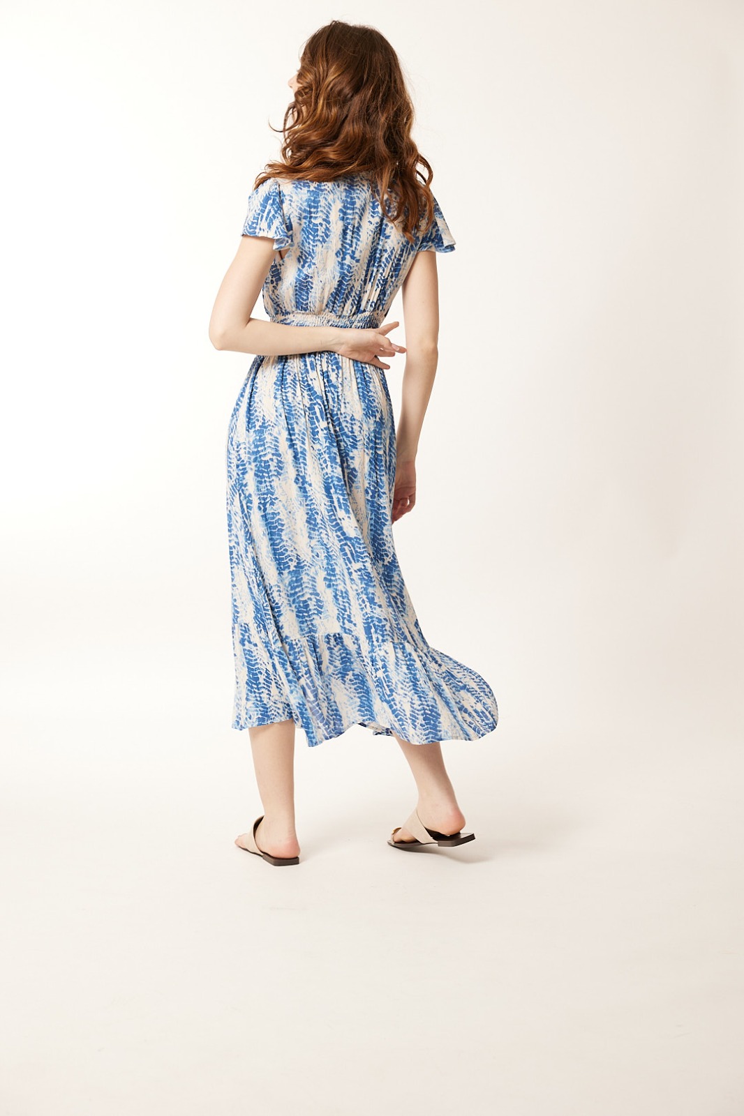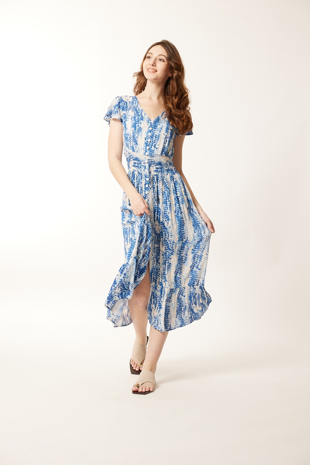Vestido Largo con Botones Estampado Azul Cintura Elástica con Tiras