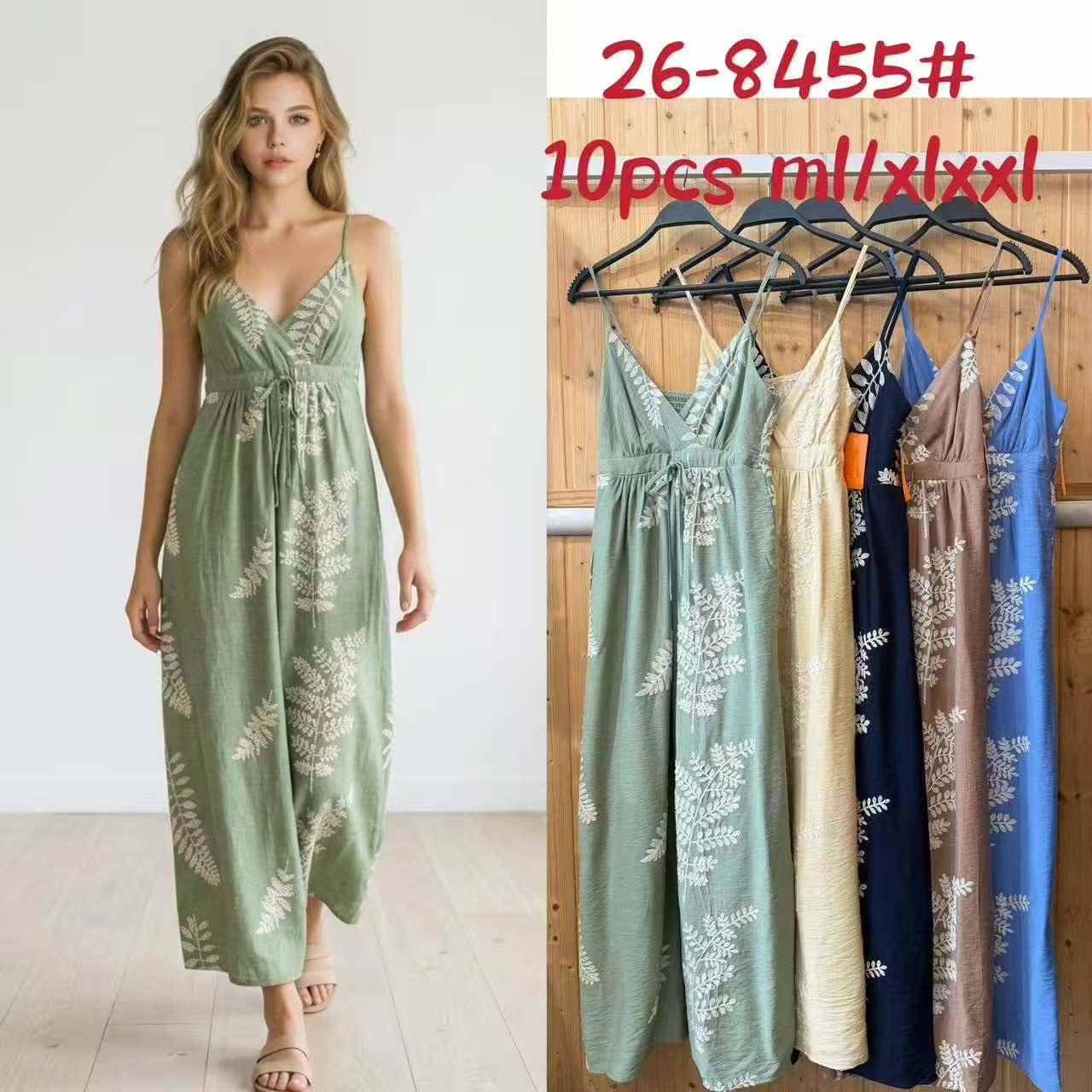 Vestido Largo Escote Cruzado con Tirantes y Bordados de Hojas