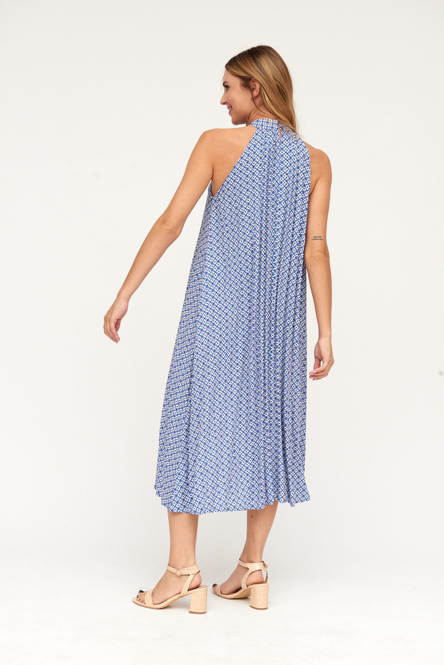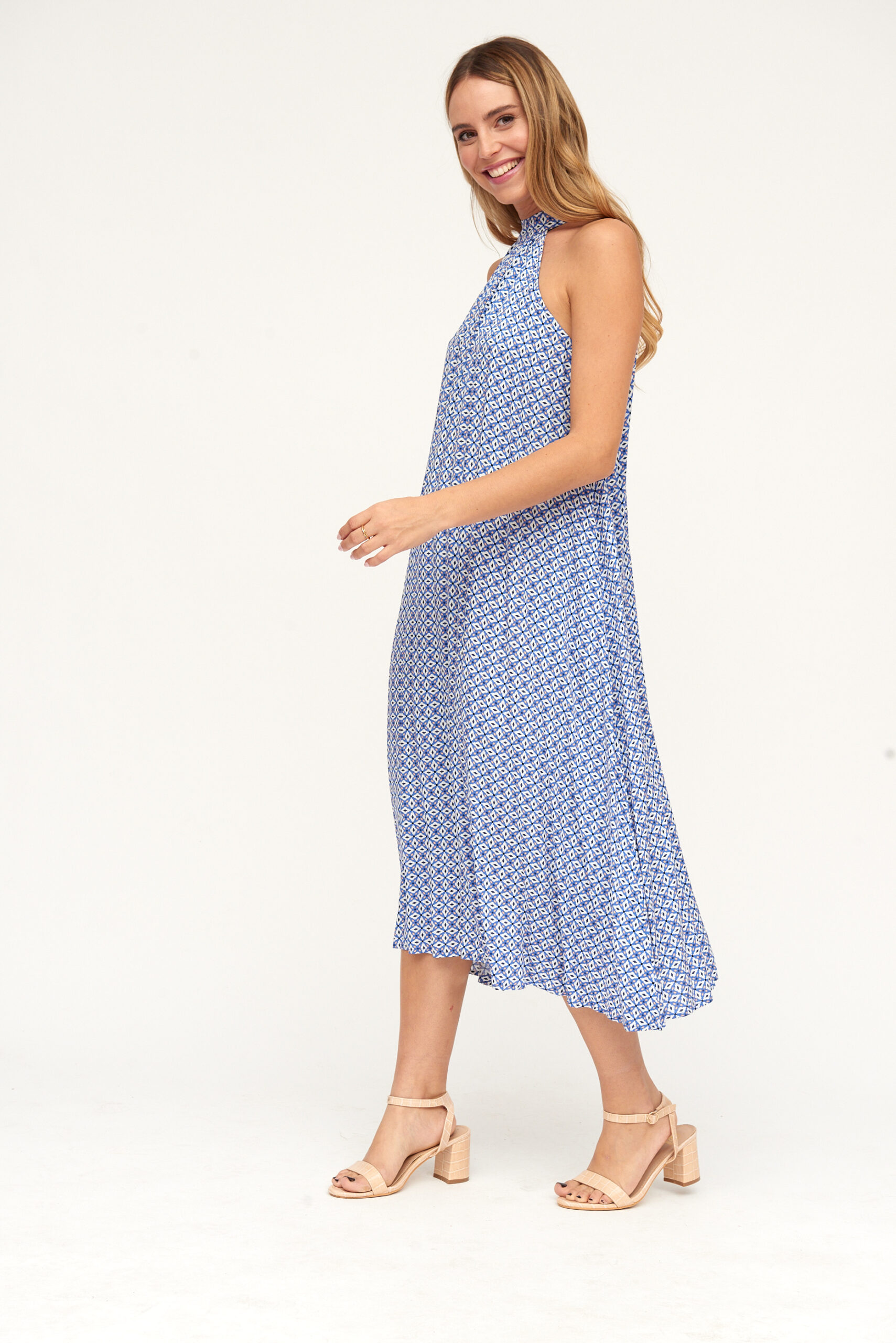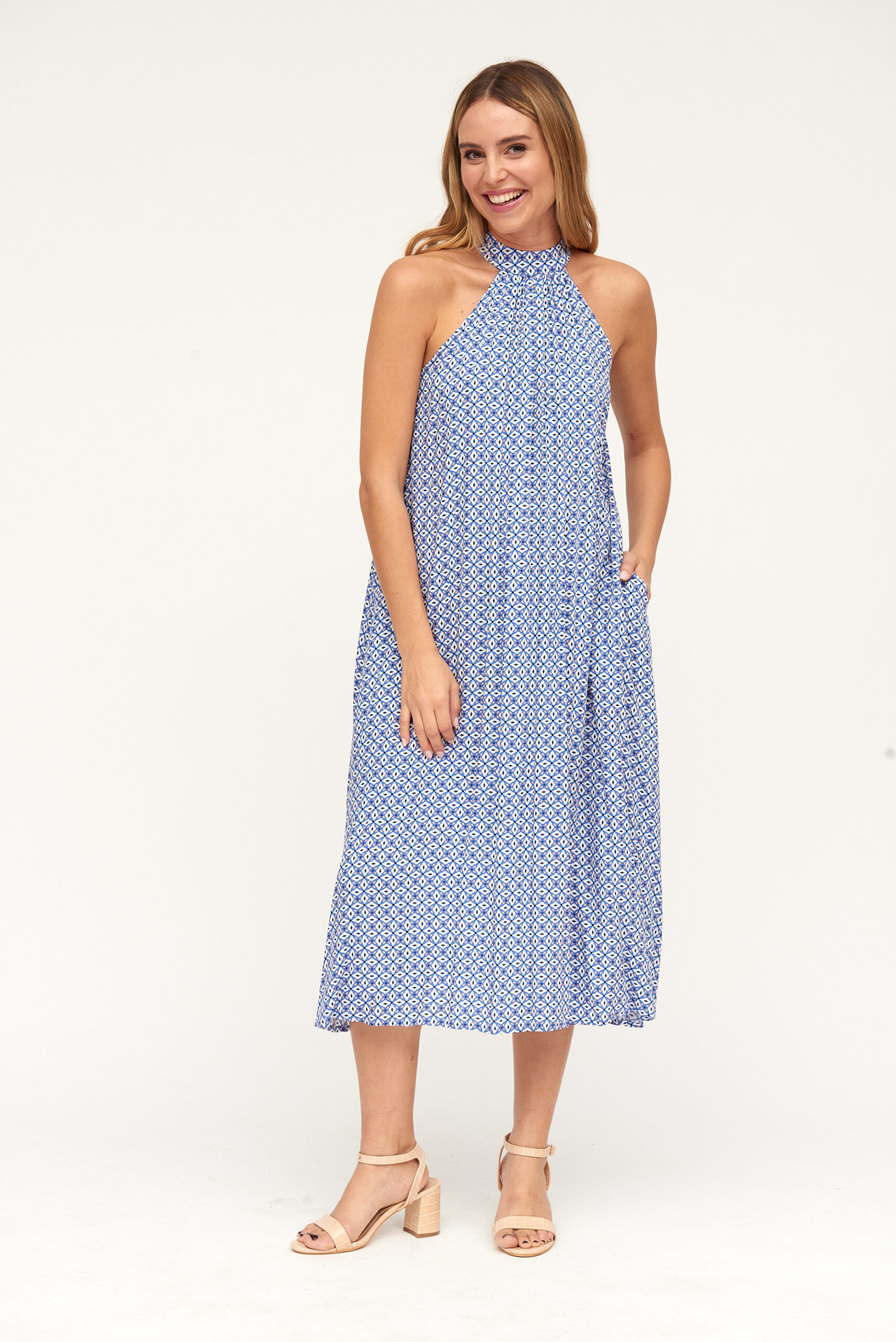 Vestido Largo Estampado Azul Rombos Cuello Halter