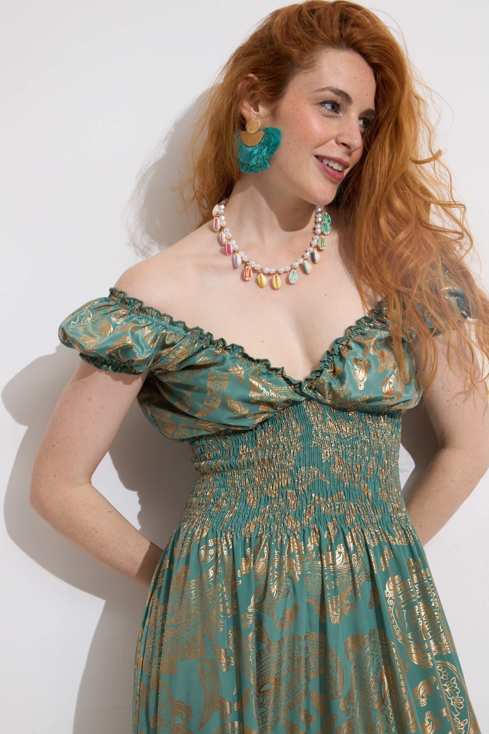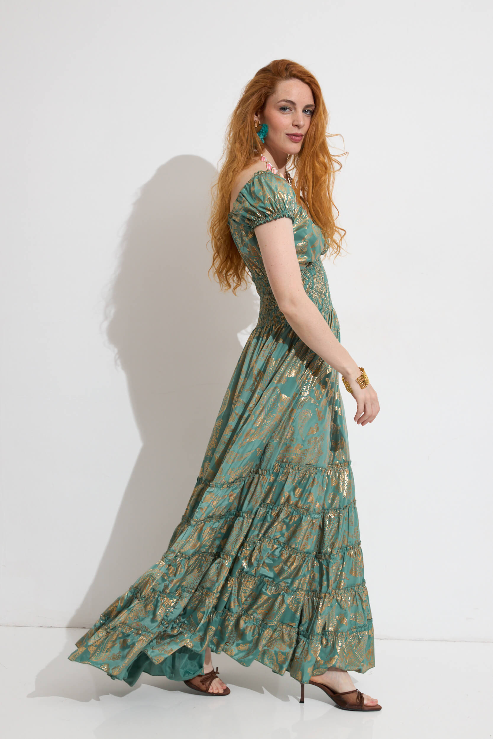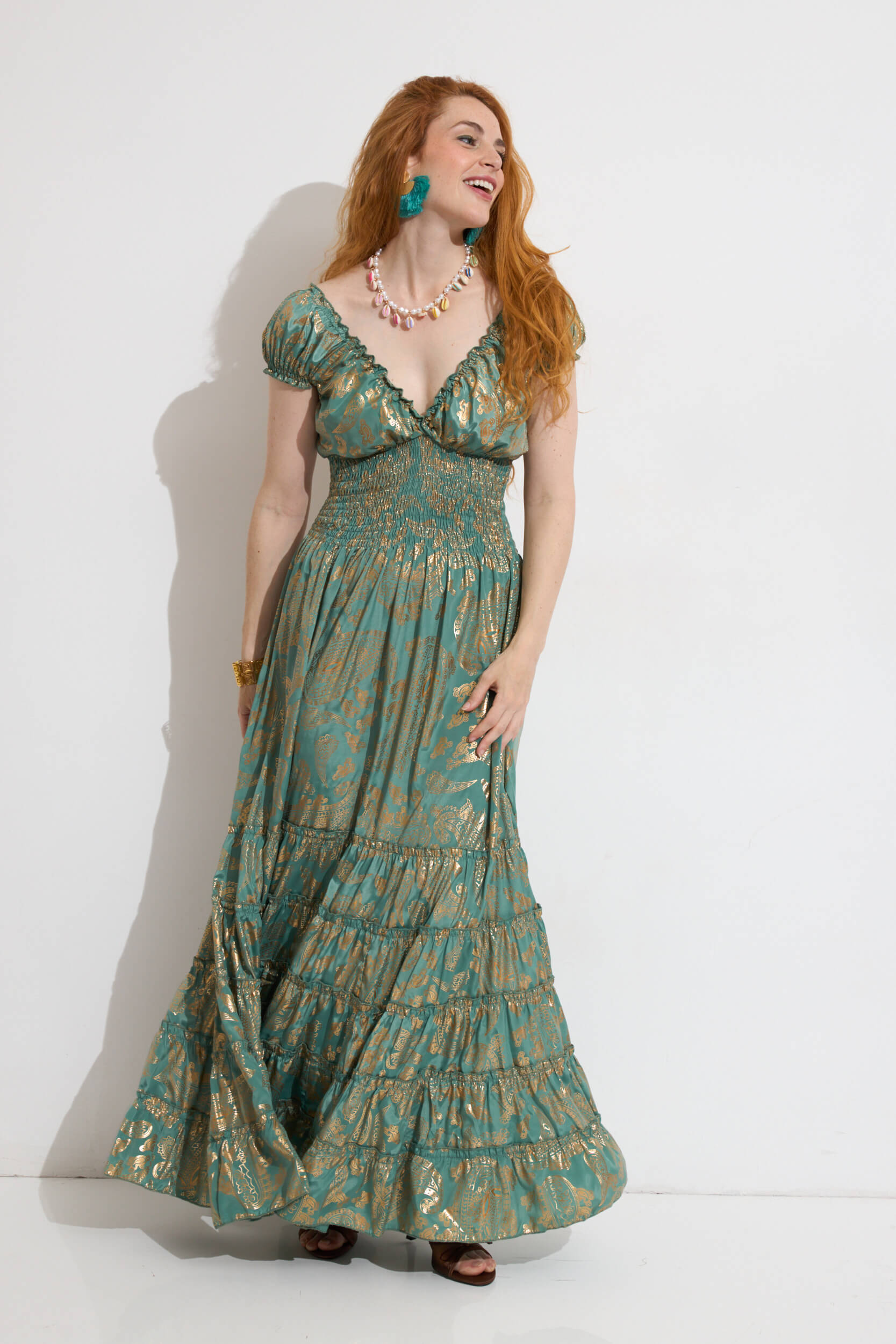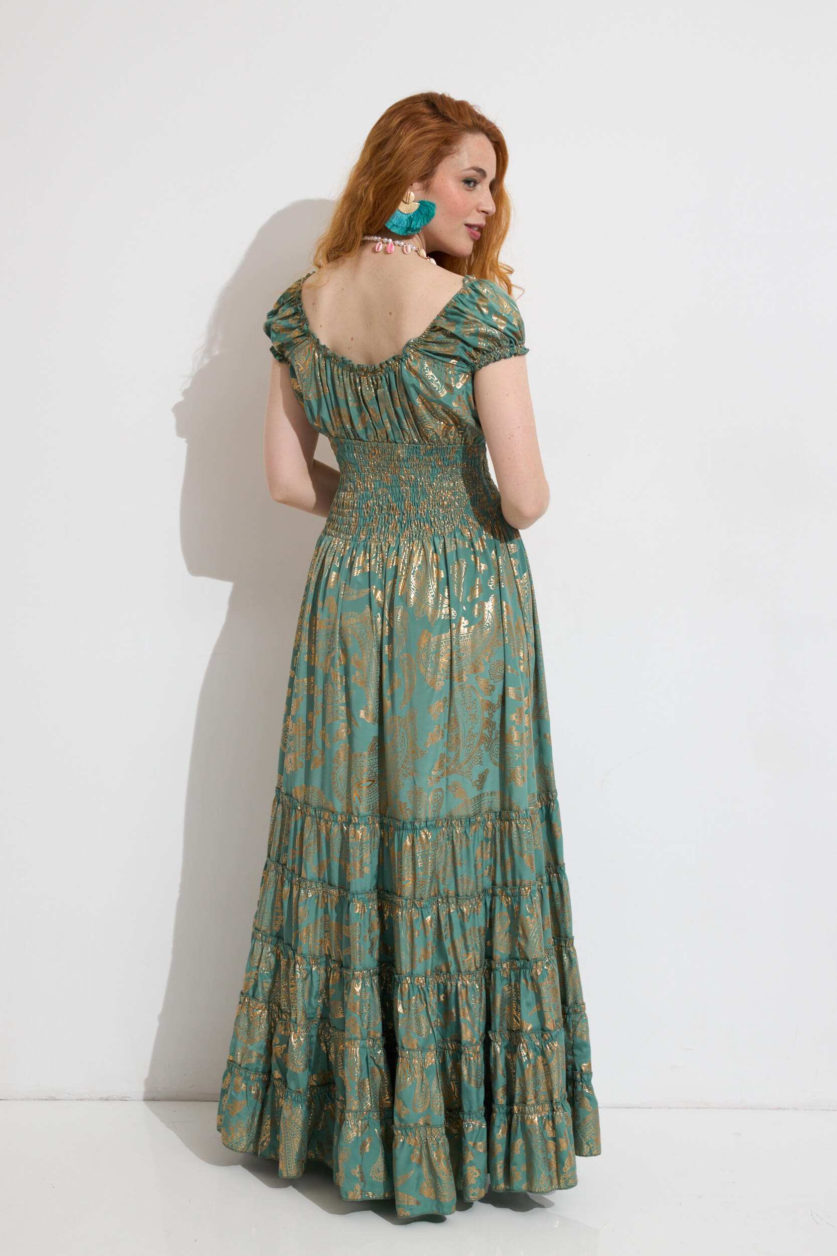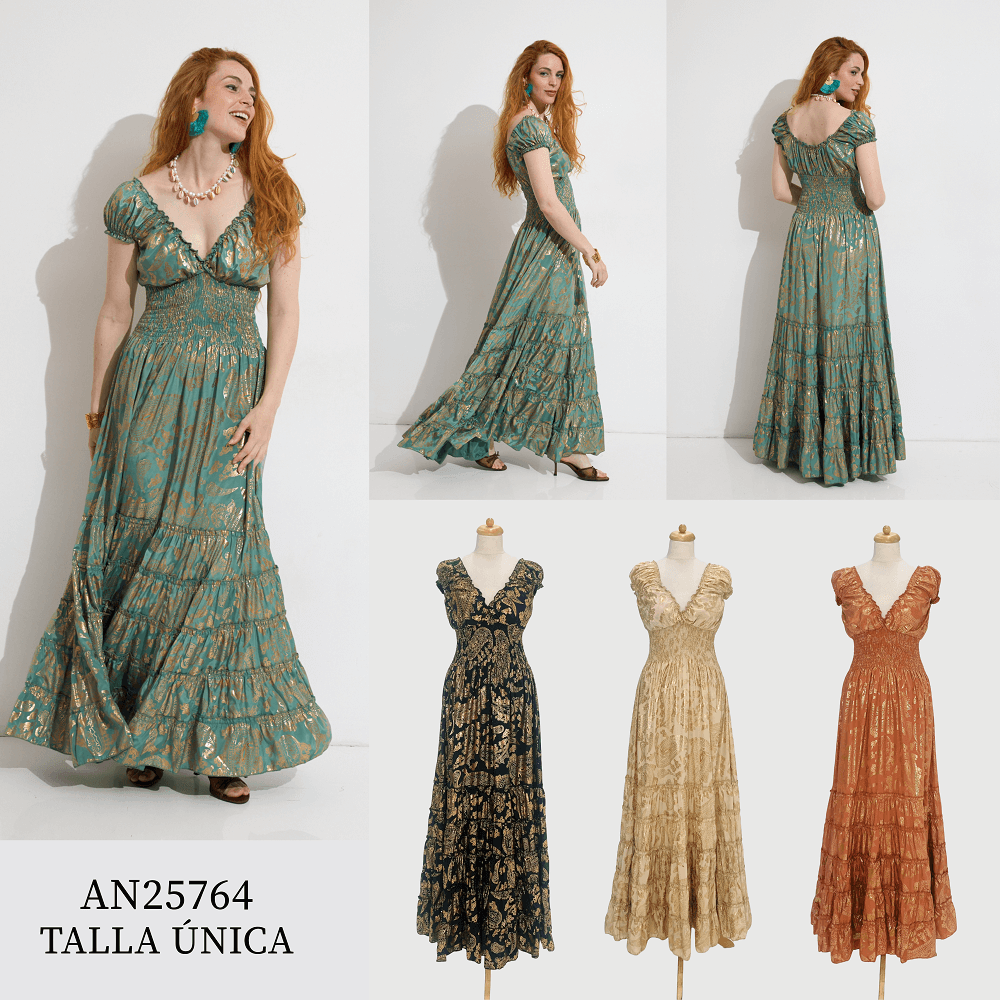 Vestido Largo Estampado Gold Print Nido de Abeja