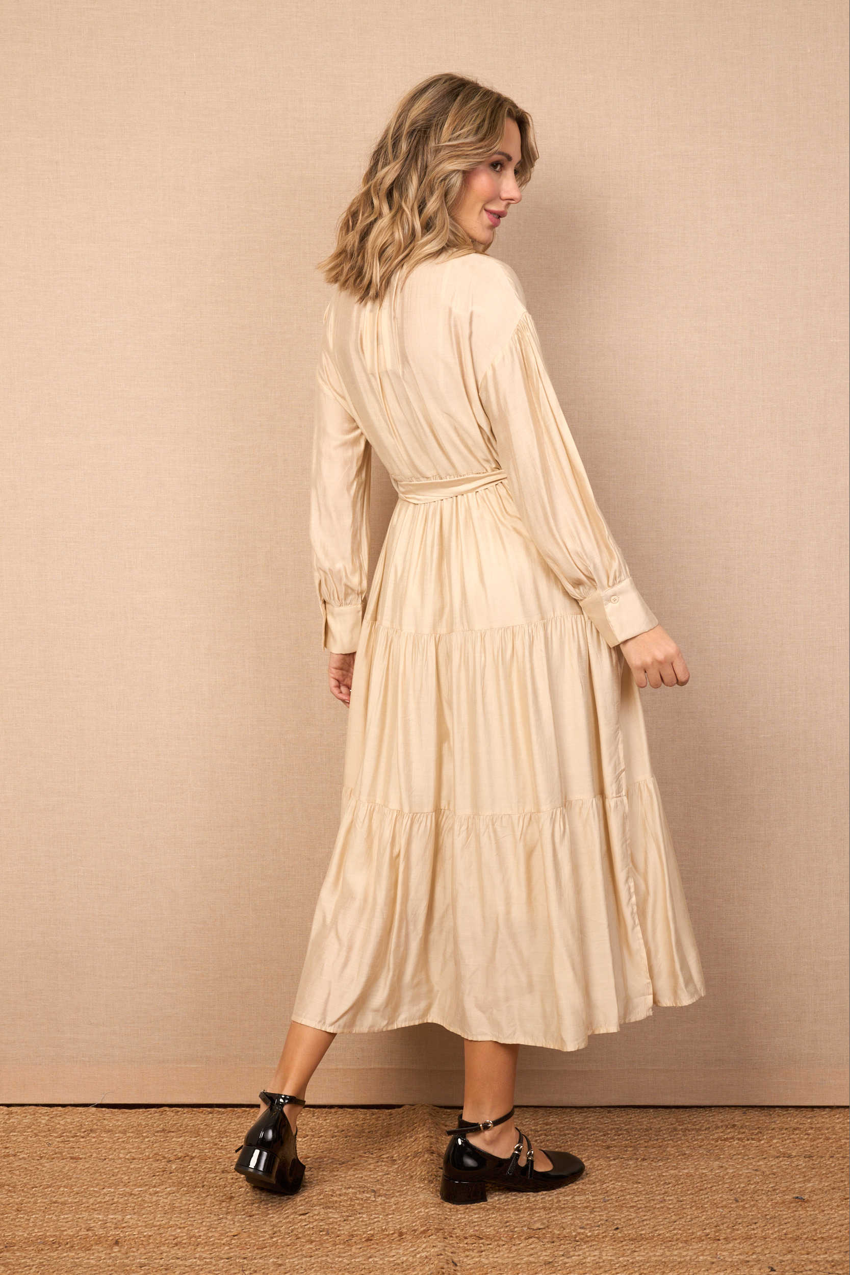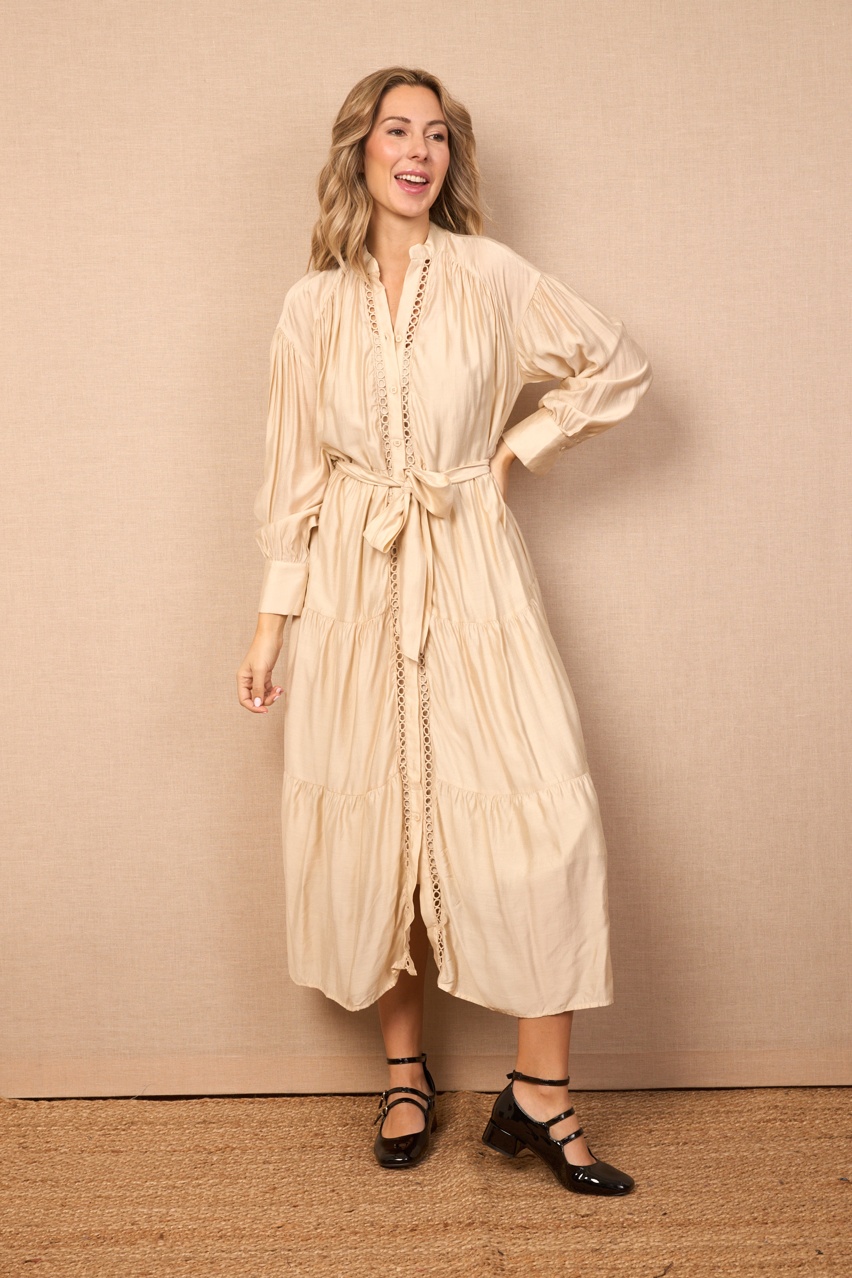 Vestido Midi Beige Detalle Lazo Cintura y Calados
