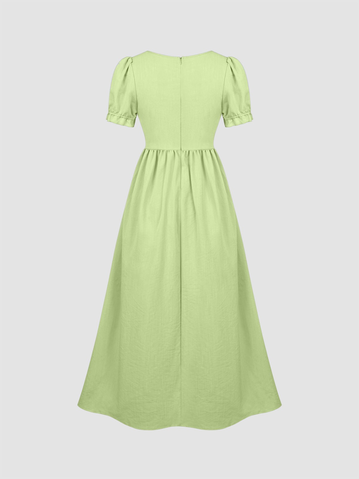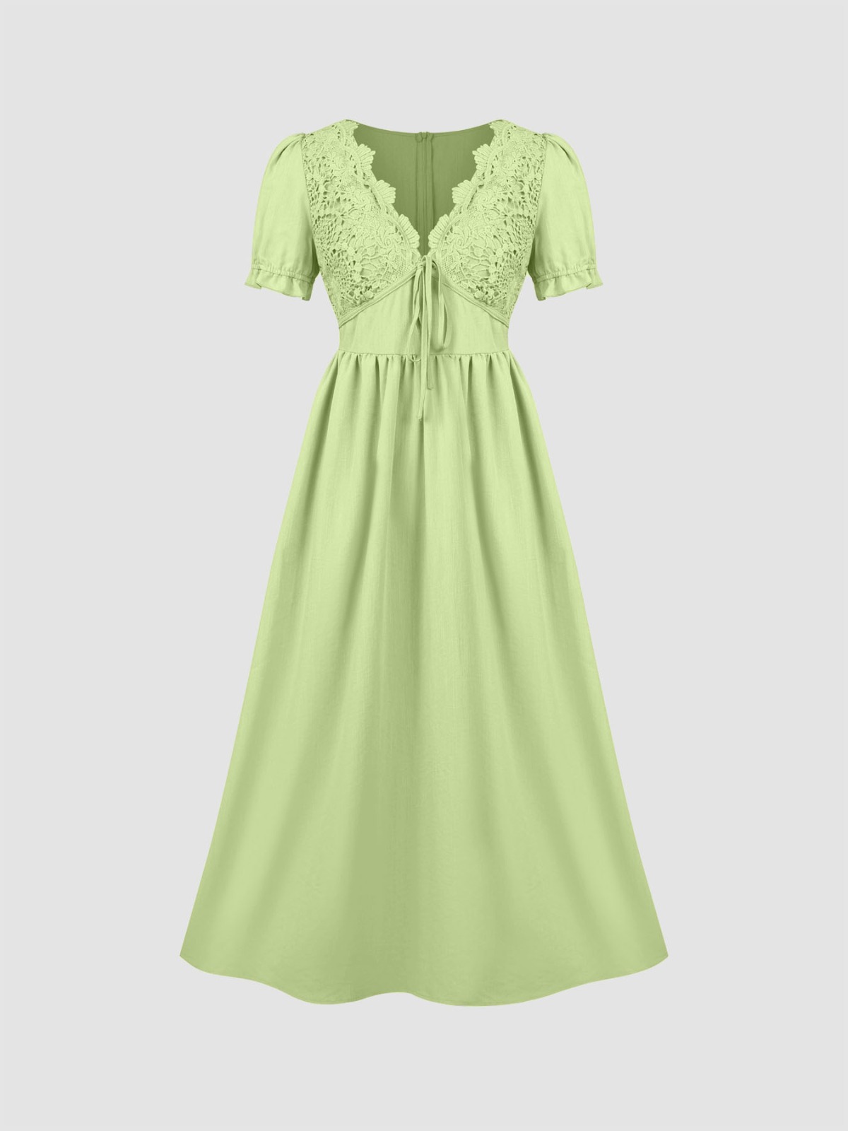 Vestido Midi Liso Escote V Detalles Calados Lazo Manga Corta