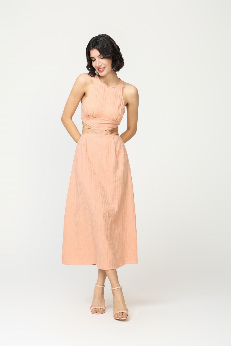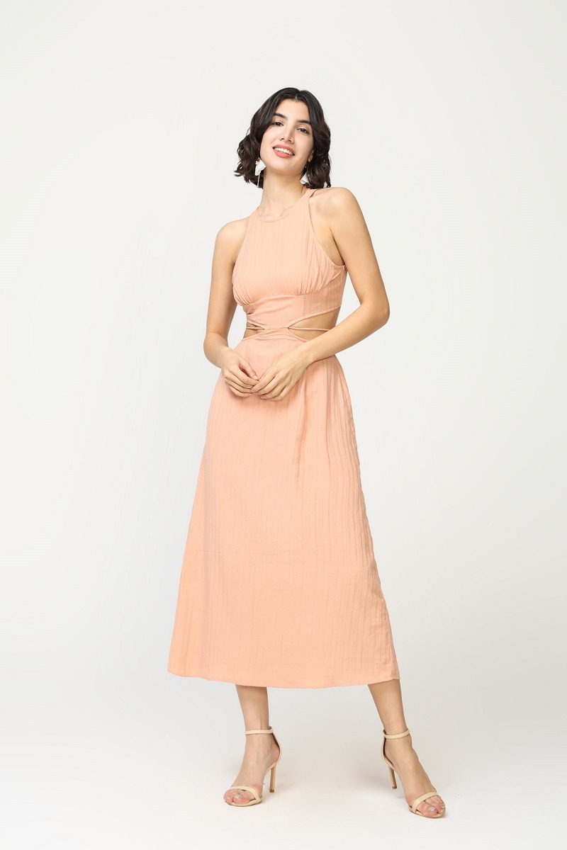 Vestido Midi Salmon Liso de Tirantes Cintura con Aberturas