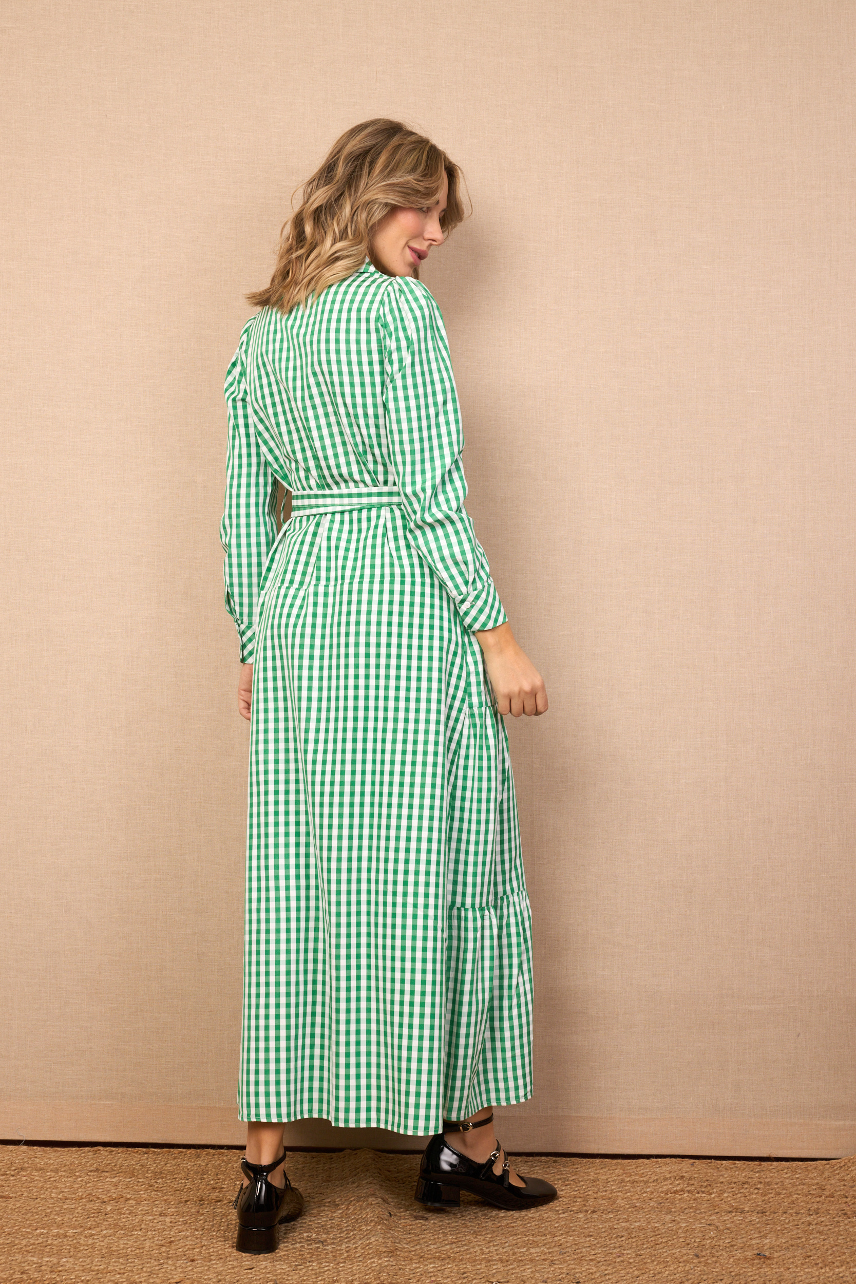Vestido Midi Verde Estampado Cuadros Detalle Cinturón
