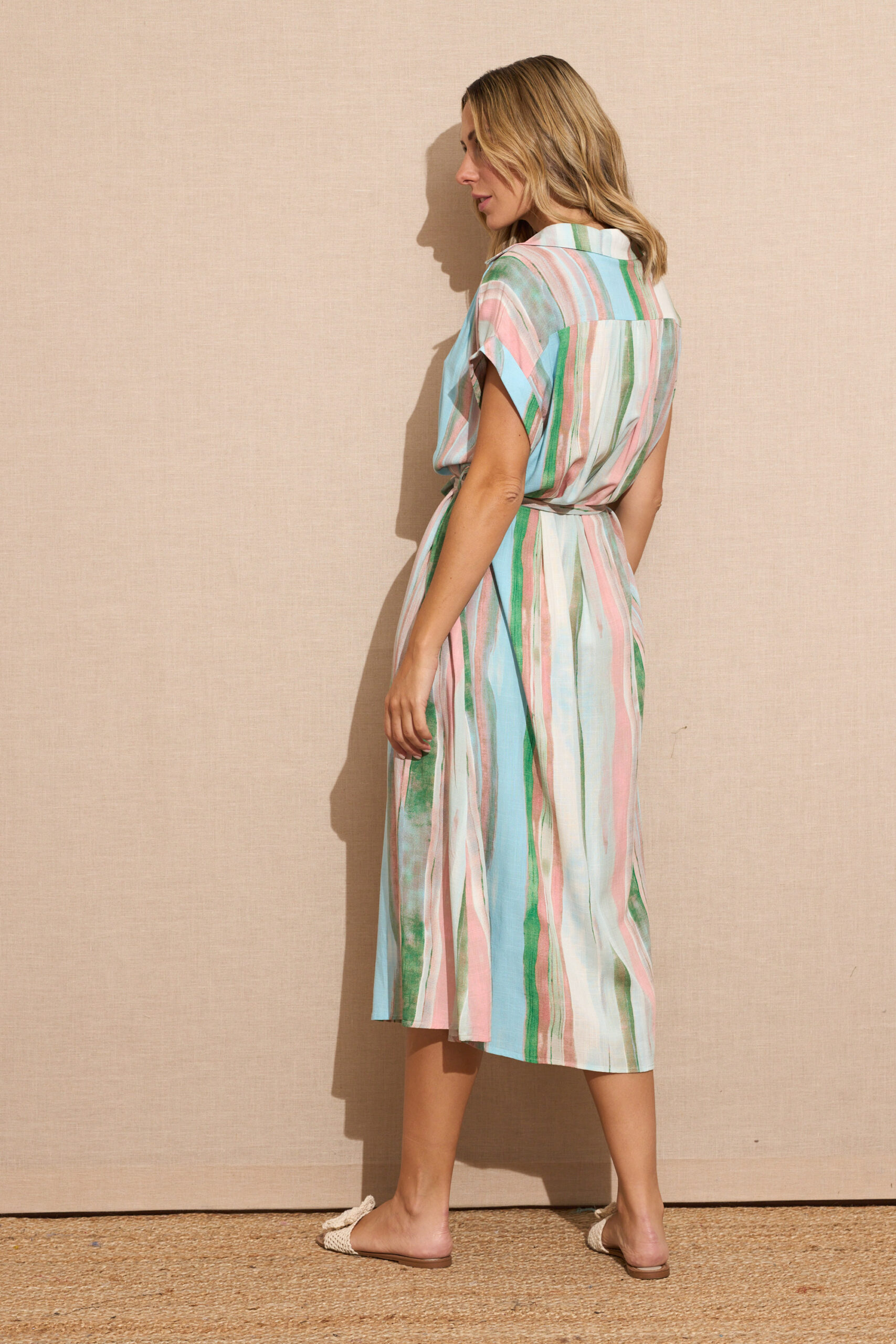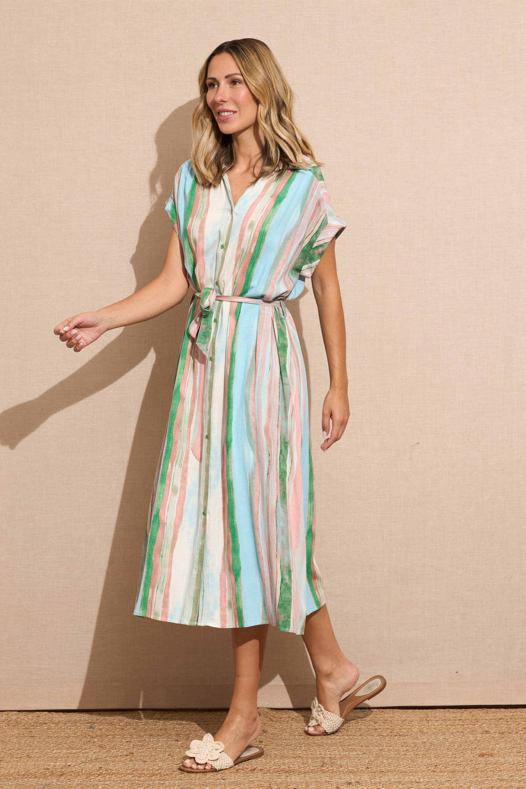Vestido Verde Largo Camisero Estampado Rayas Manga Corta